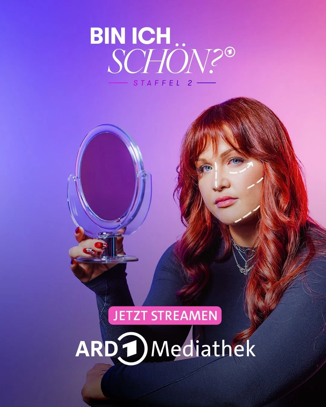 Promotion für die zweite Staffel der deutschen Serie "Bin ich schön?" mit einer Frau, die in den Spiegel schaut, um sich selbst zu betrachten, mit einem Farbverlauf im Hintergrund und Text, der zum Streamen auf ARD Mediathek auffordert.